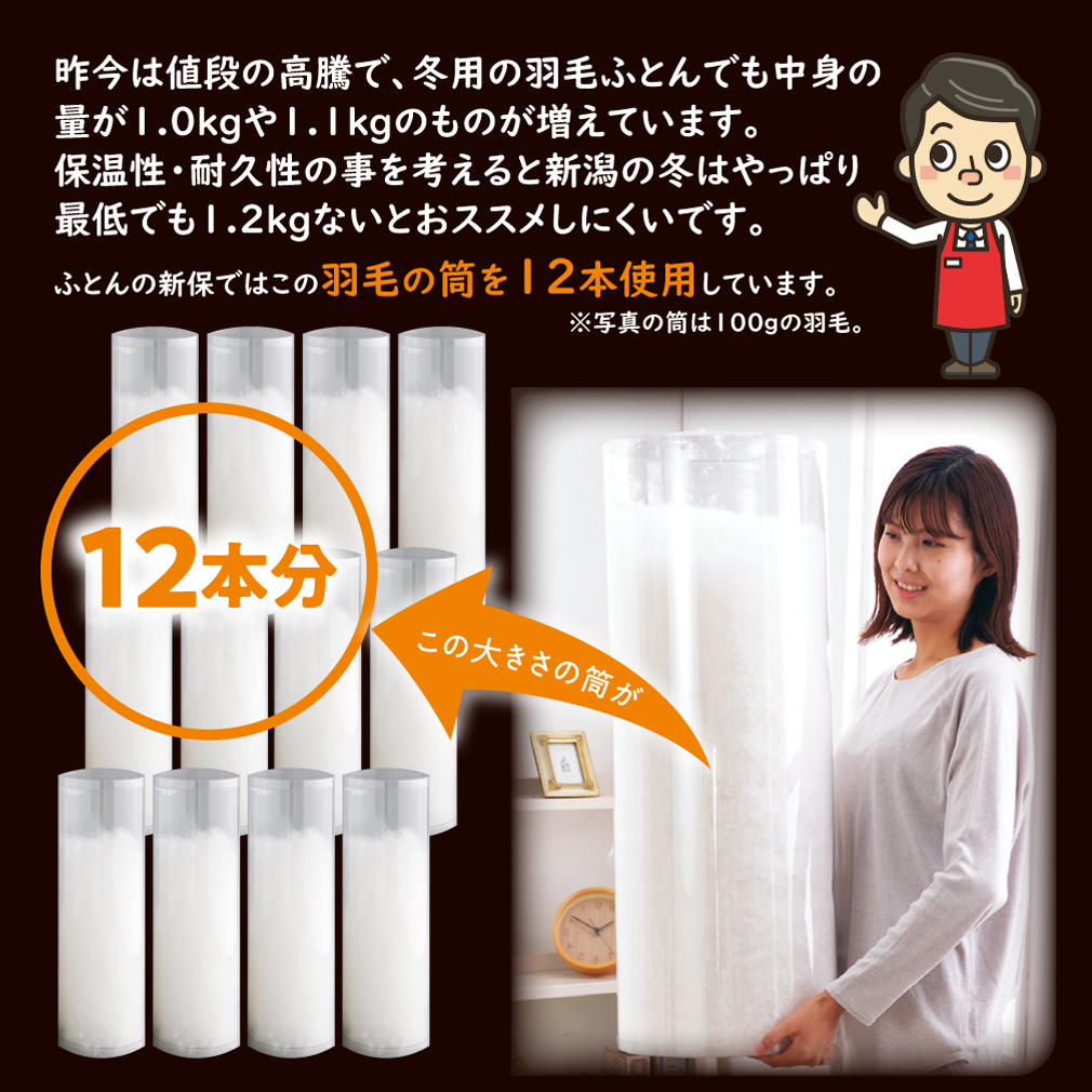 さらに、近年価格を抑えるためなのか、ダブルサイズ1.5kg入れが増えてきましたが、新潟の冬はやっぱり寒いので最低でも1.7kgは必要です!!