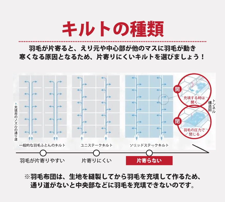 長く使用すると中央部が薄くなってしまいますが、キルティングが原因でなっている羽毛ふとんも多数ございます。羽毛が傷んで薄くなるのは仕方がないことですが、片寄りやすいキルティングで暖かさを損なわれるのは非常に残念です。